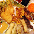 Chicken Satay, Shrimp Shumai, Curry Triangles, BBQ Wings, Veggie Rolls, Crab Rangoon, and Veggie Tempura served with assorted sauces